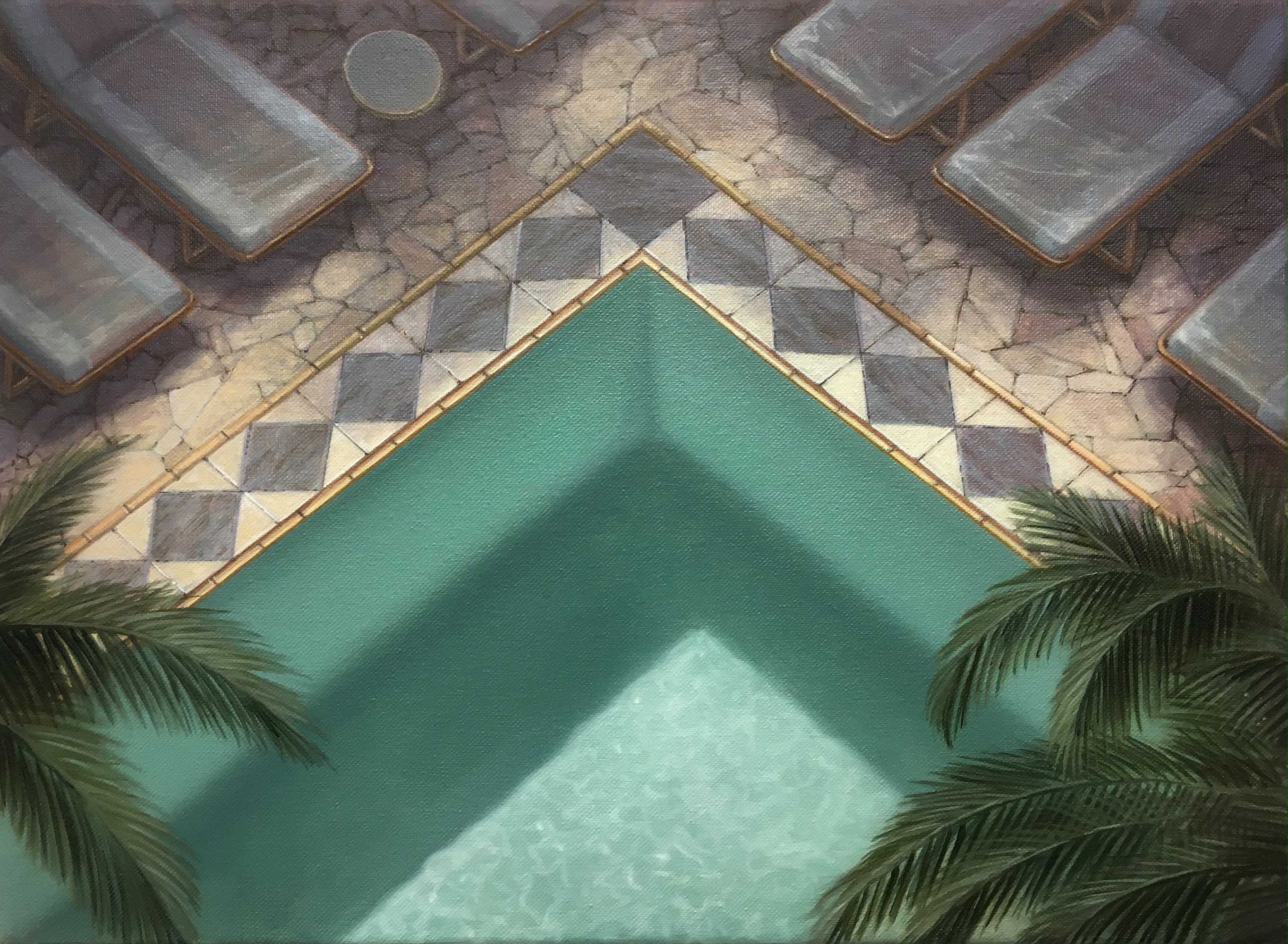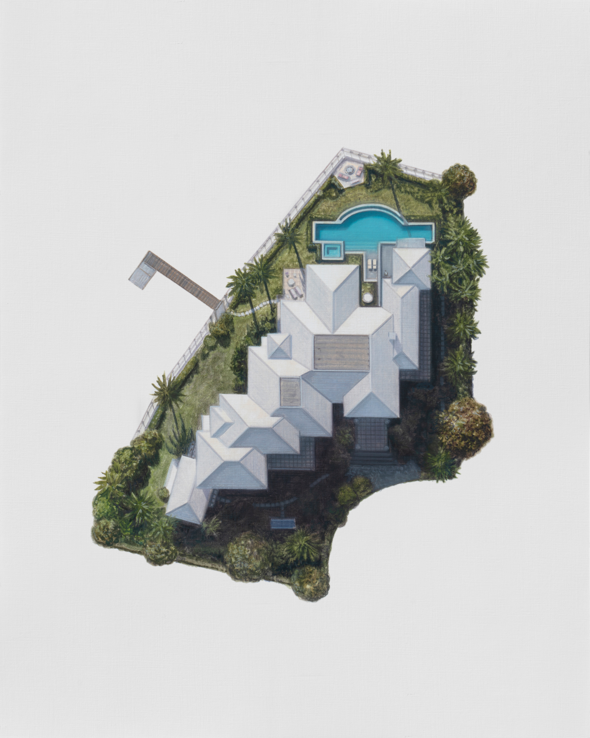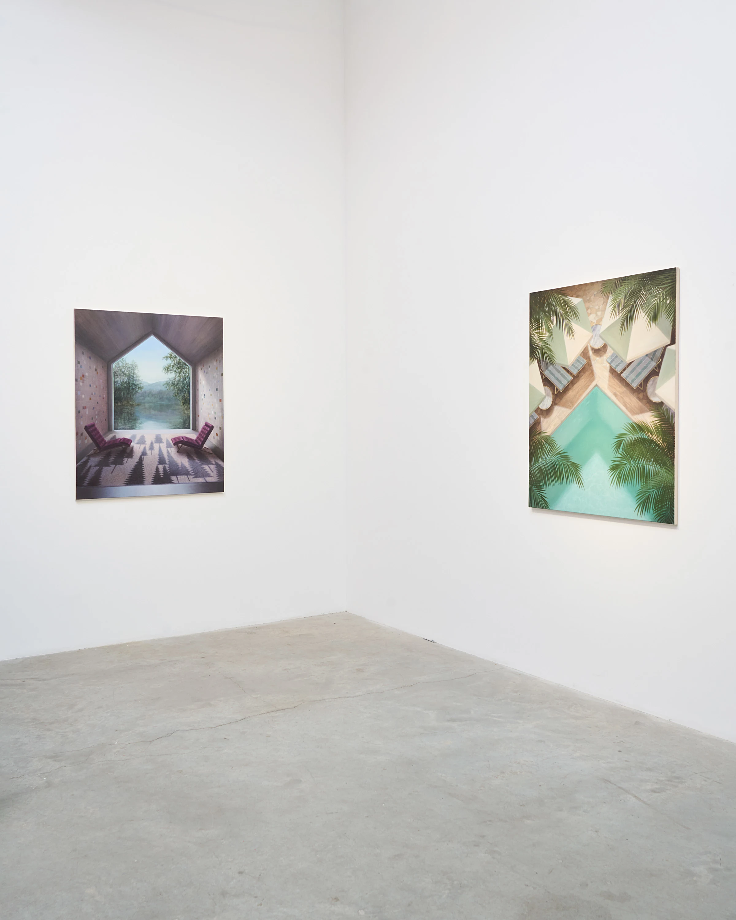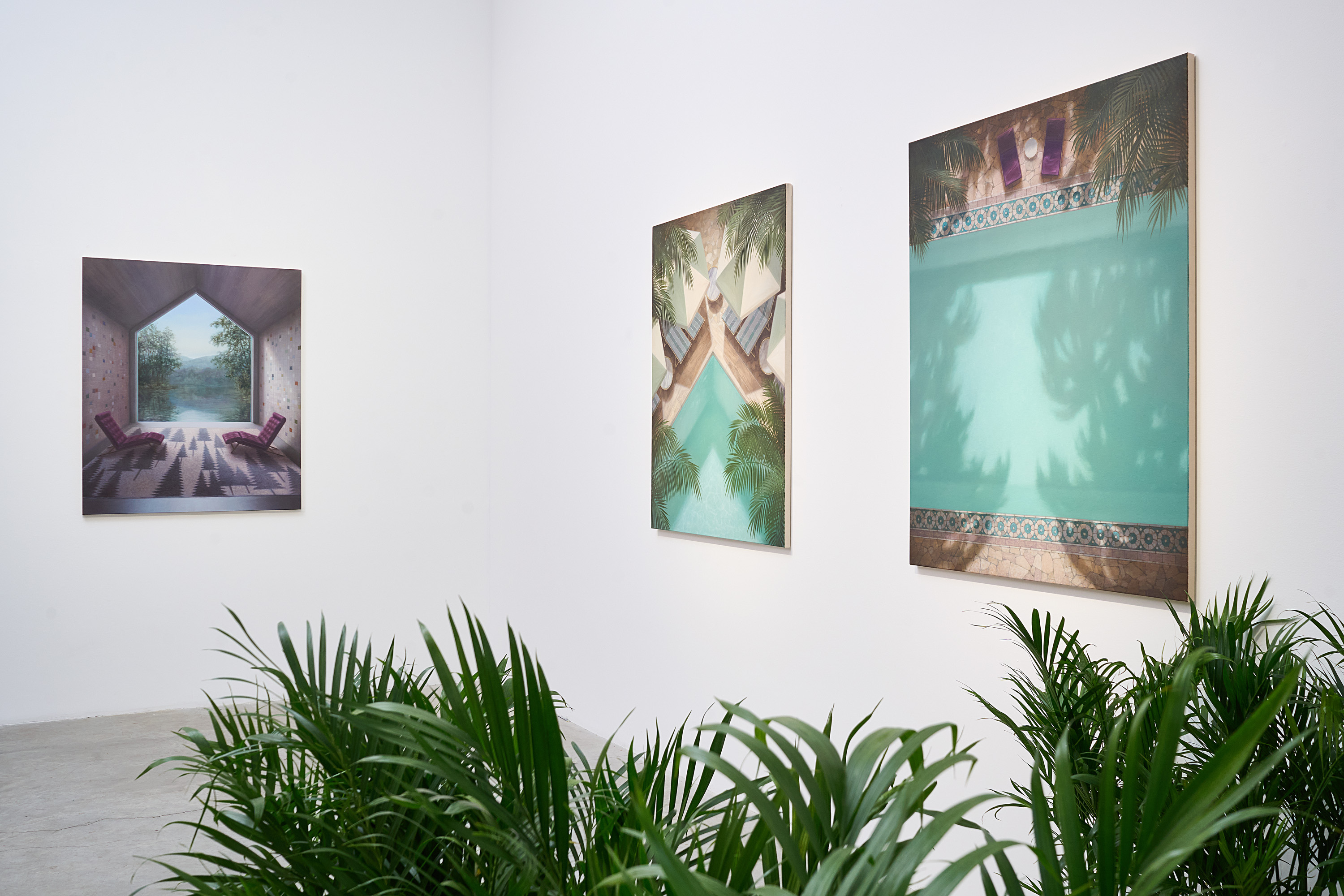 The first solo exhibition of Melanie Siegel in the historic district of Tribeca, New York, presents a body of work that continues the artist’s practice, which explores the interplay between natural and artificial environments and the tension between utopia and dystopia. Her paintings depict geometrically precise, uninhabited scenes such as swimming pools, tennis courts, and residential spaces iconic symbols of leisure and artificial paradise. These imagined spaces, devoid of narrative specificity, invite viewers to project their own interpretations, prompting reflection on humanity’s relationship with constructed realities.