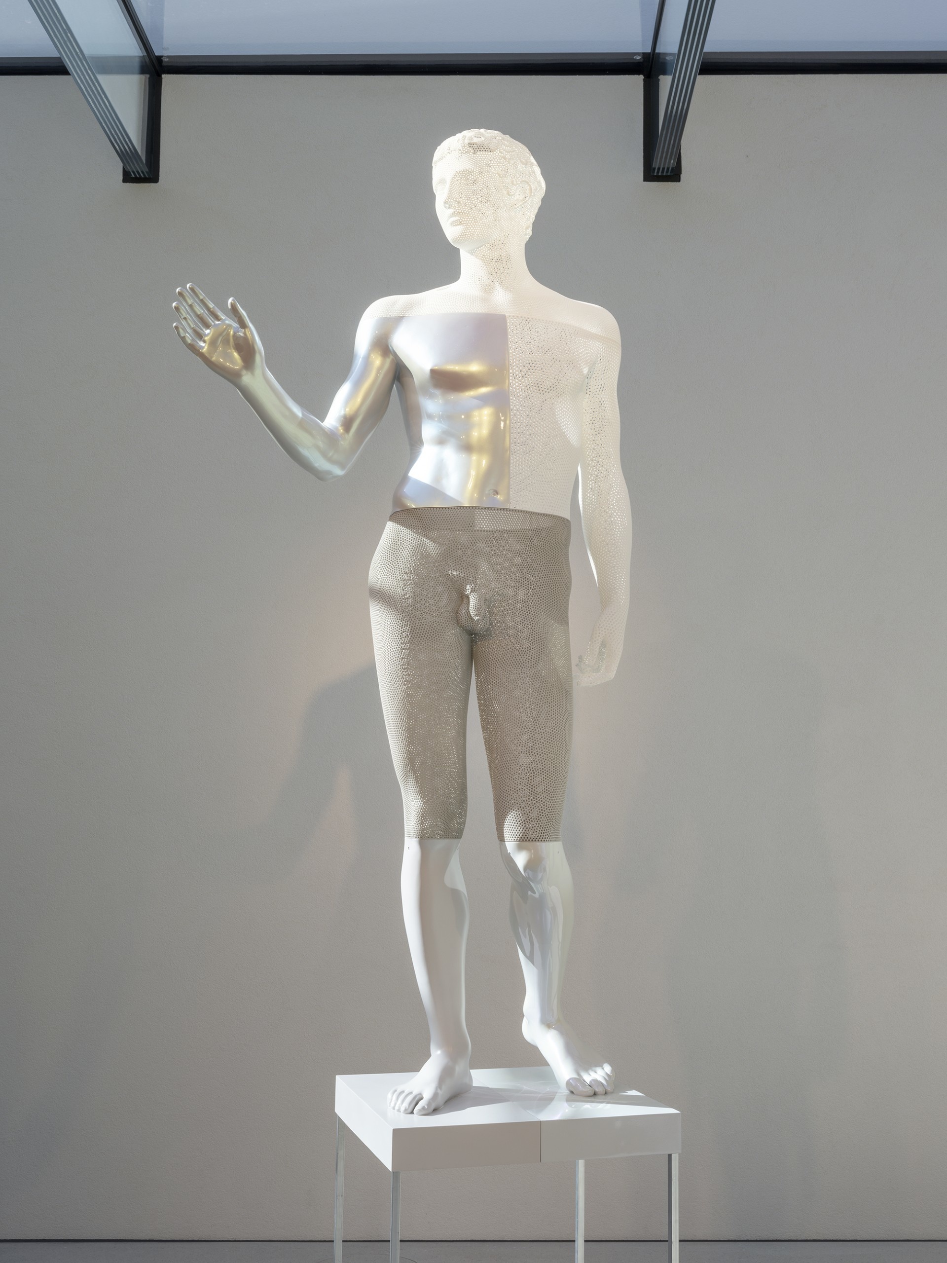 Oliver Laric utilizes digital technologies such as 3D scanning and printing to question concepts of originality and historical continuity. His translucent sculpture Jüngling vom Magdalensberg explores the fluid boundary between the ancient and the contemporary, emphasizing transparency, digital abstraction, and the disintegration of material identity.