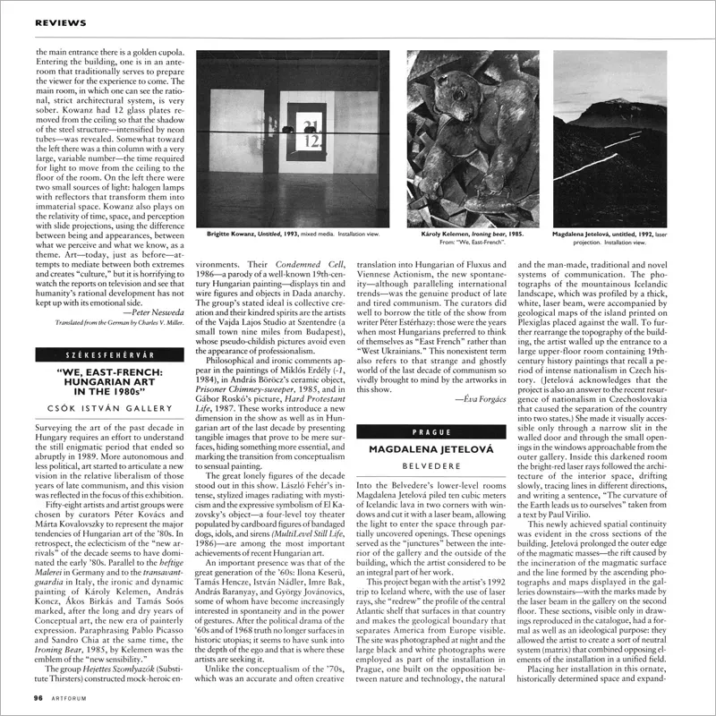 This project began with the artist’s 1992 trip to Iceland where, with the use of laser rays, she “redrew” the profile of the central Atlantic shelf that surfaces in that country and makes the geological boundary that separates America from Europe visible. The site was photographed at night and the large black and white photographs were employed as part of the installation in Prague, one built on the opposition between nature and technology, the natural and the man-made, traditional and novel systems of communication. The photographs of the mountainous Icelandic landscape, which was profiled by a thick, white, laser beam, were accompanied by geological maps of the island printed on Plexiglas placed against the wall. To further rearrange the topography of the building, the artist walled up the entrance to a large upper-floor room containing 19th-century history paintings that recall a period of intense nationalism in Czech history. (Jetelová acknowledges that the project is also an answer to the recent resurgence of nationalism in Czechoslovakia that caused the separation of the country into two states.) She made it visually accessible only through a narrow slit in the walled door and through the small openings in the windows approachable from the outer gallery. Inside this darkened room the bright-red laser rays followed the architecture of the interior space, drifting slowly, tracing lines in different directions, and writing a sentence, “The curvature of the Earth leads us to ourselves” taken from a text by Paul Virilio.