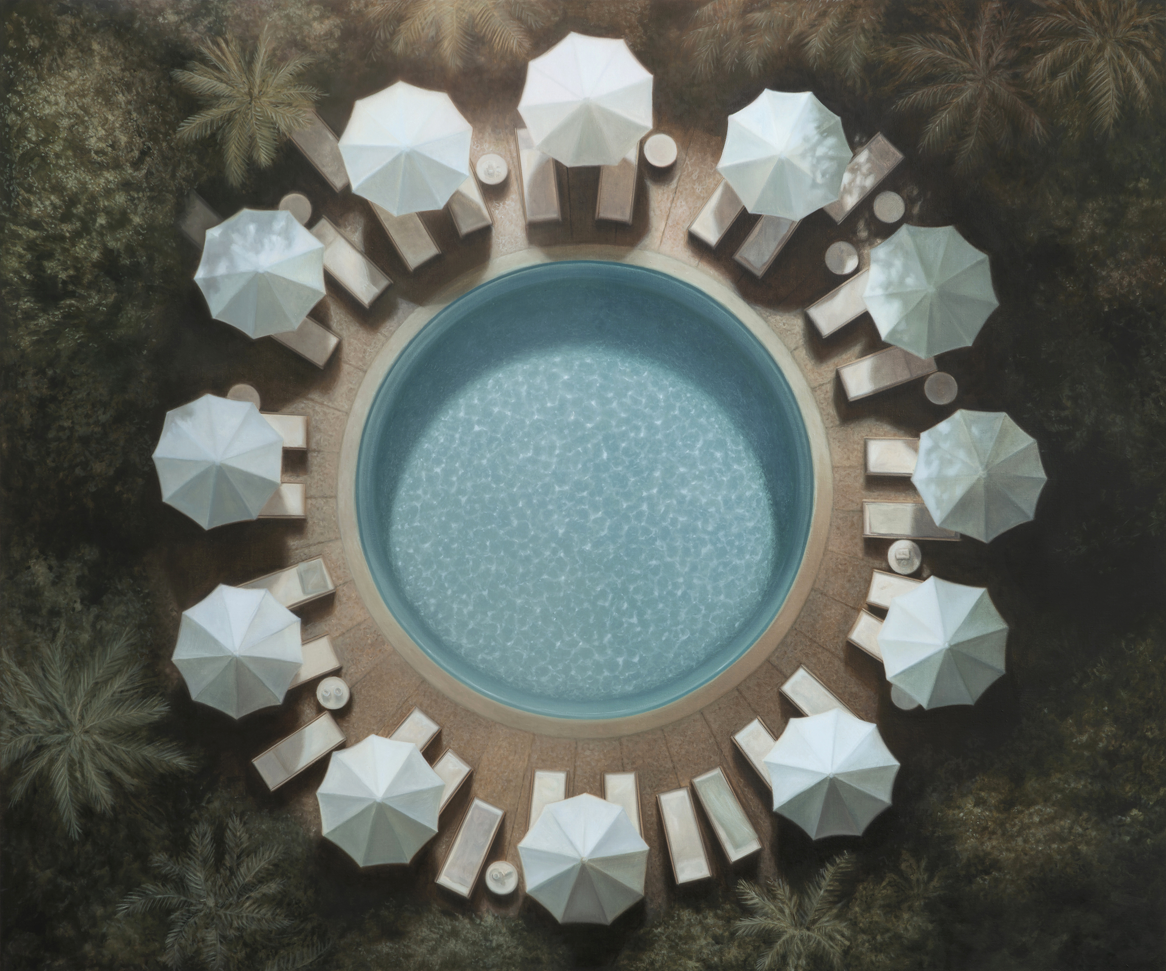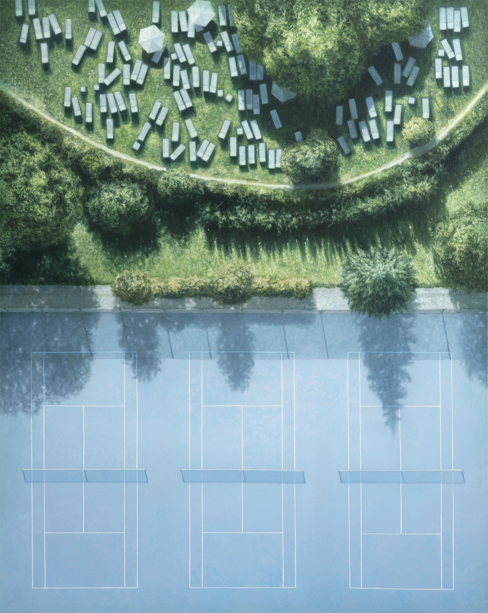 Human and nature meet in the works of Melanie Siegel in a constructed lifeworld. In her examination of real places and landscapes, the painter creates fictitious and idealized landscapes. The subjects undergo numerous transformations in preliminary studies and during the actual painting process on the canvas. The pictorial spaces themselves, which are reminiscent of clinical model landscapes, are just as constructed as the man-made landscape. Apparent calm and harmony permeate the deserted sceneries. However, the stagings are characterized by a subtly ambivalent atmosphere. On the threshold between utopia and dystopia, the allegories tell of the contrast between longing for nature and human intervention in the environment. The depicted motifs usually appear from a bird's eye view. This supposedly objective perspective is clearly structured and creates both a supposed distance and a certain anonymity between the viewer and the place. The connection is restored through a familiar motif, such as idyllically placed tennis courts. Nevertheless, the scene appears surreal, as the motifs defy the familiar view of these places.