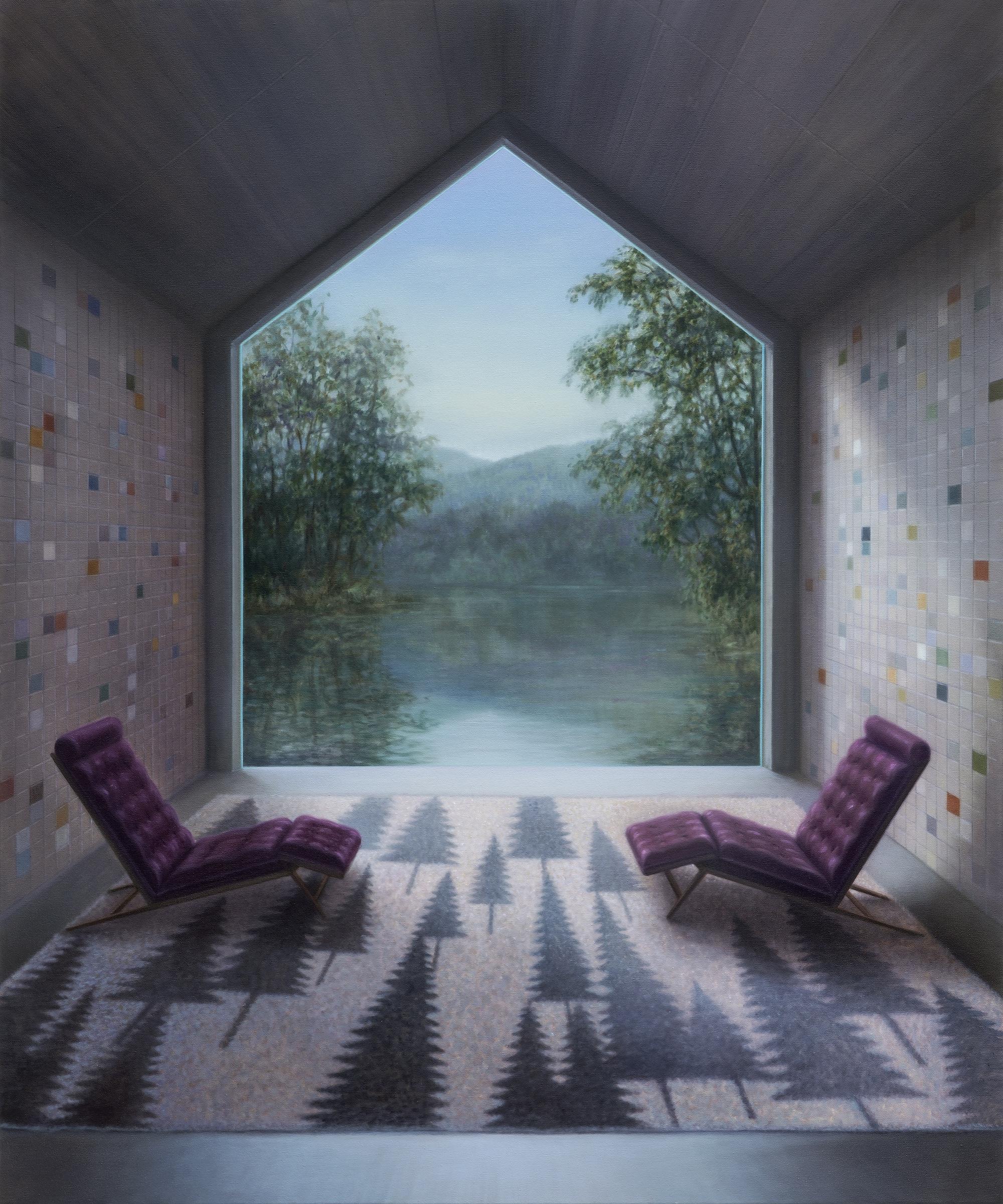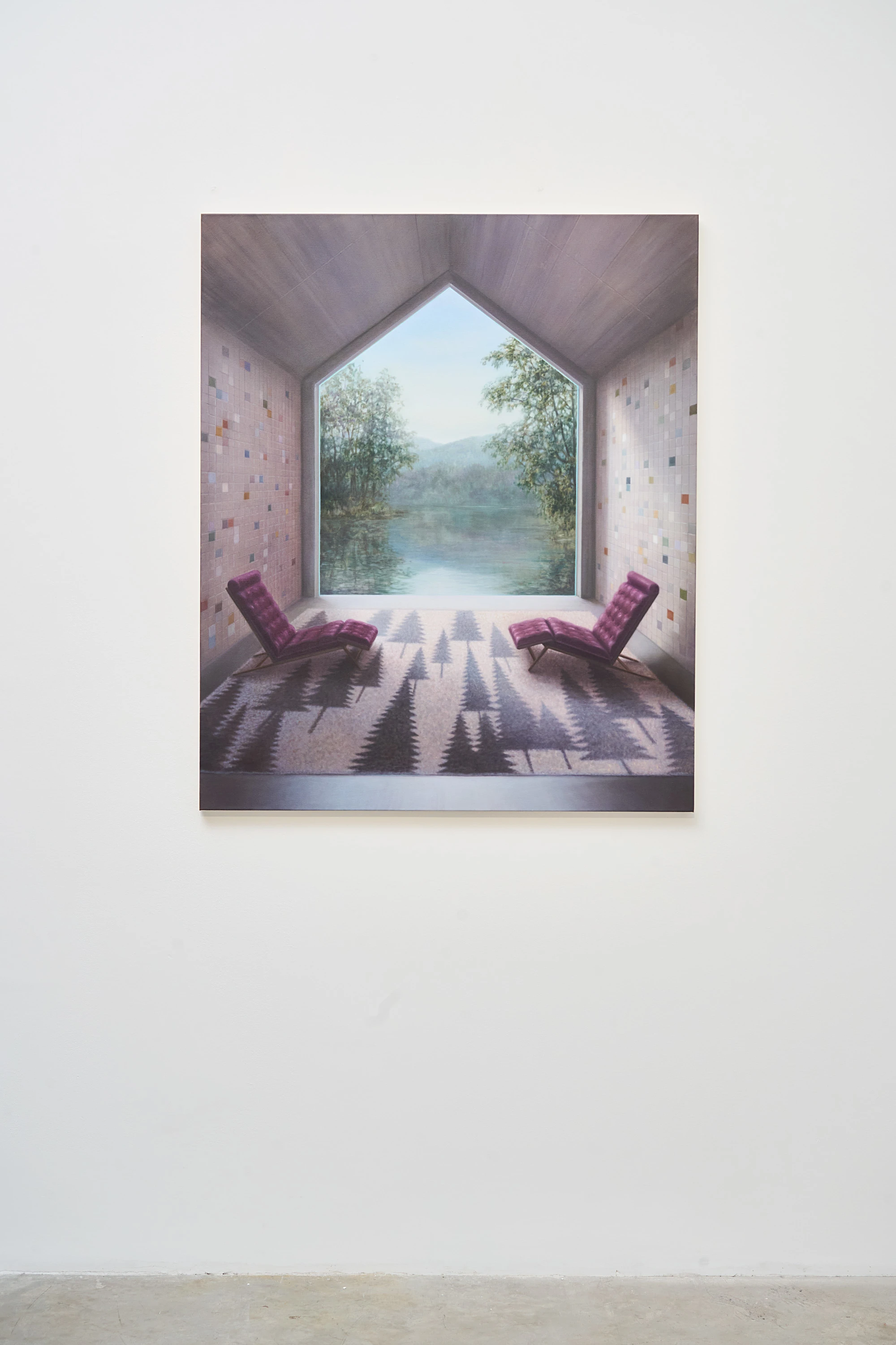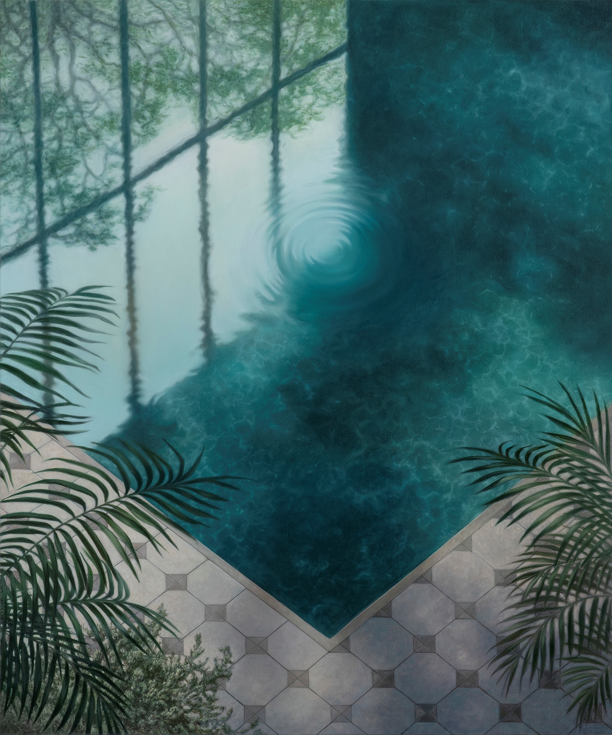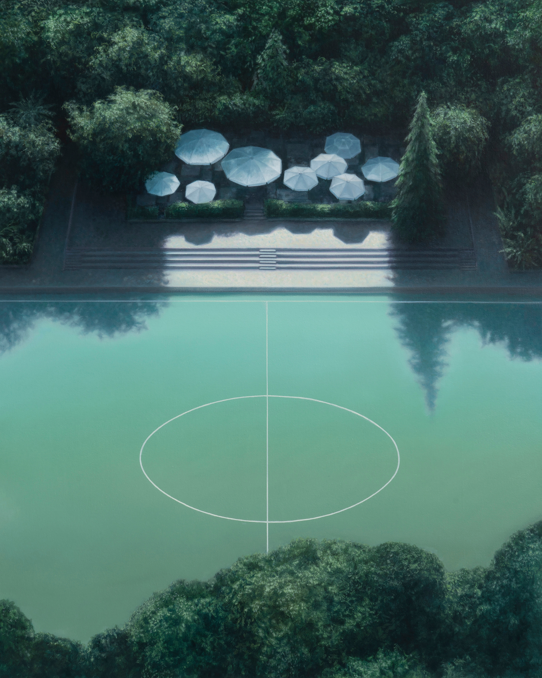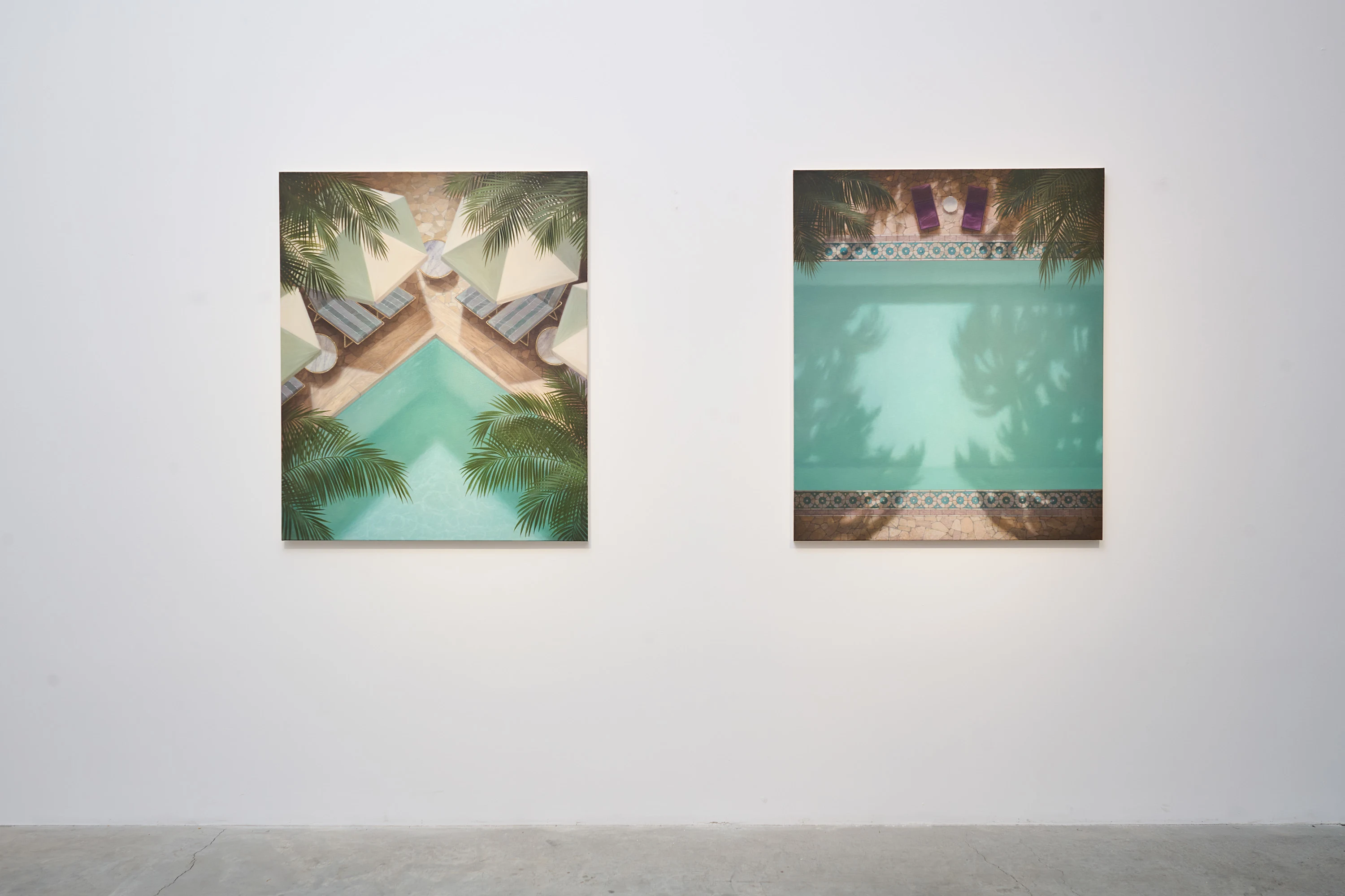 The first solo exhibition of Melanie Siegel in the historic district of Tribeca, New York, presents a body of work that continues the artist’s practice, which explores the interplay between natural and artificial environments and the tension between utopia and dystopia. Her paintings depict geometrically precise, uninhabited scenes such as swimming pools, tennis courts, and residential spaces iconic symbols of leisure and artificial paradise. These imagined spaces, devoid of narrative specificity, invite viewers to project their own interpretations, prompting reflection on humanity’s relationship with constructed realities.