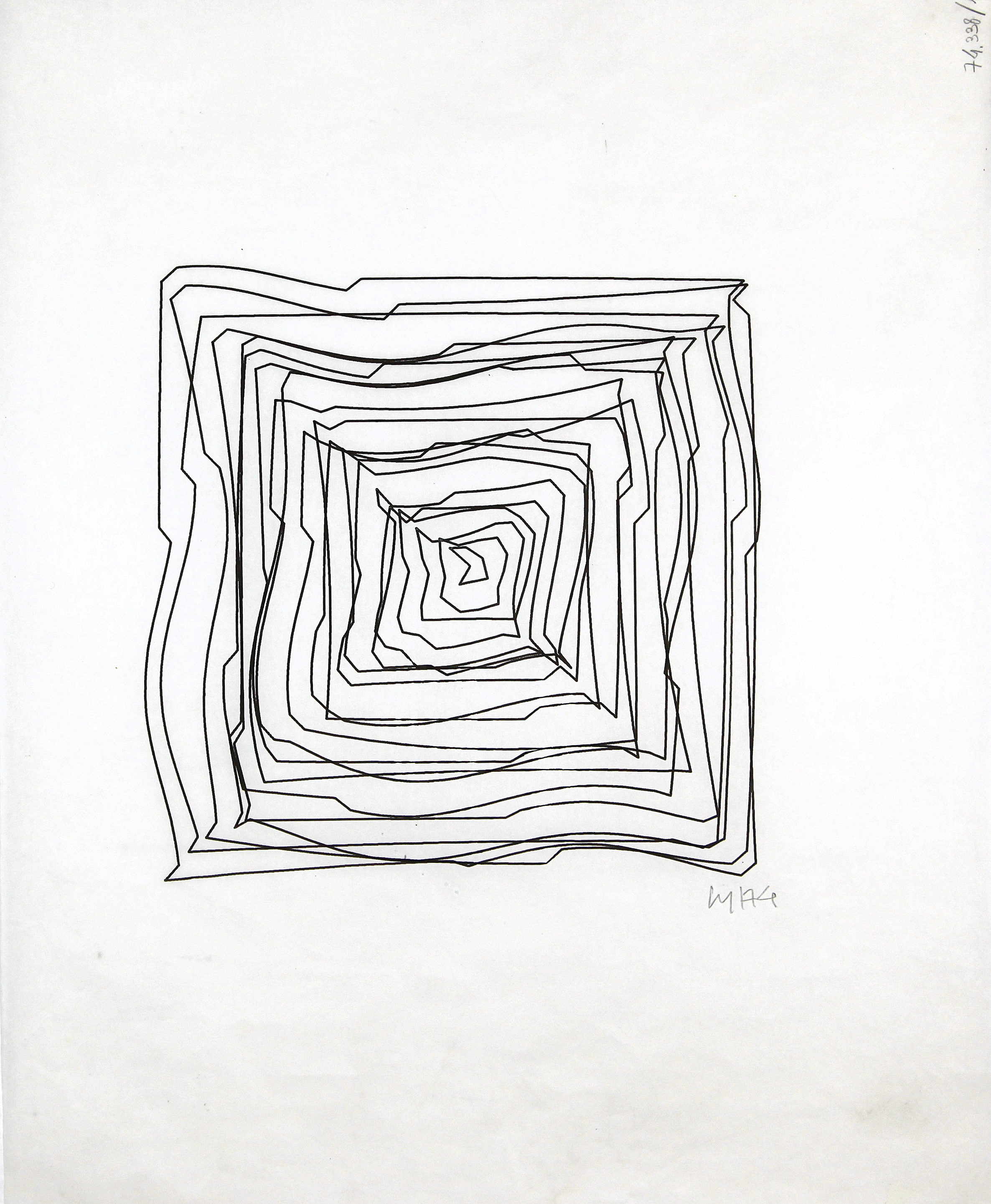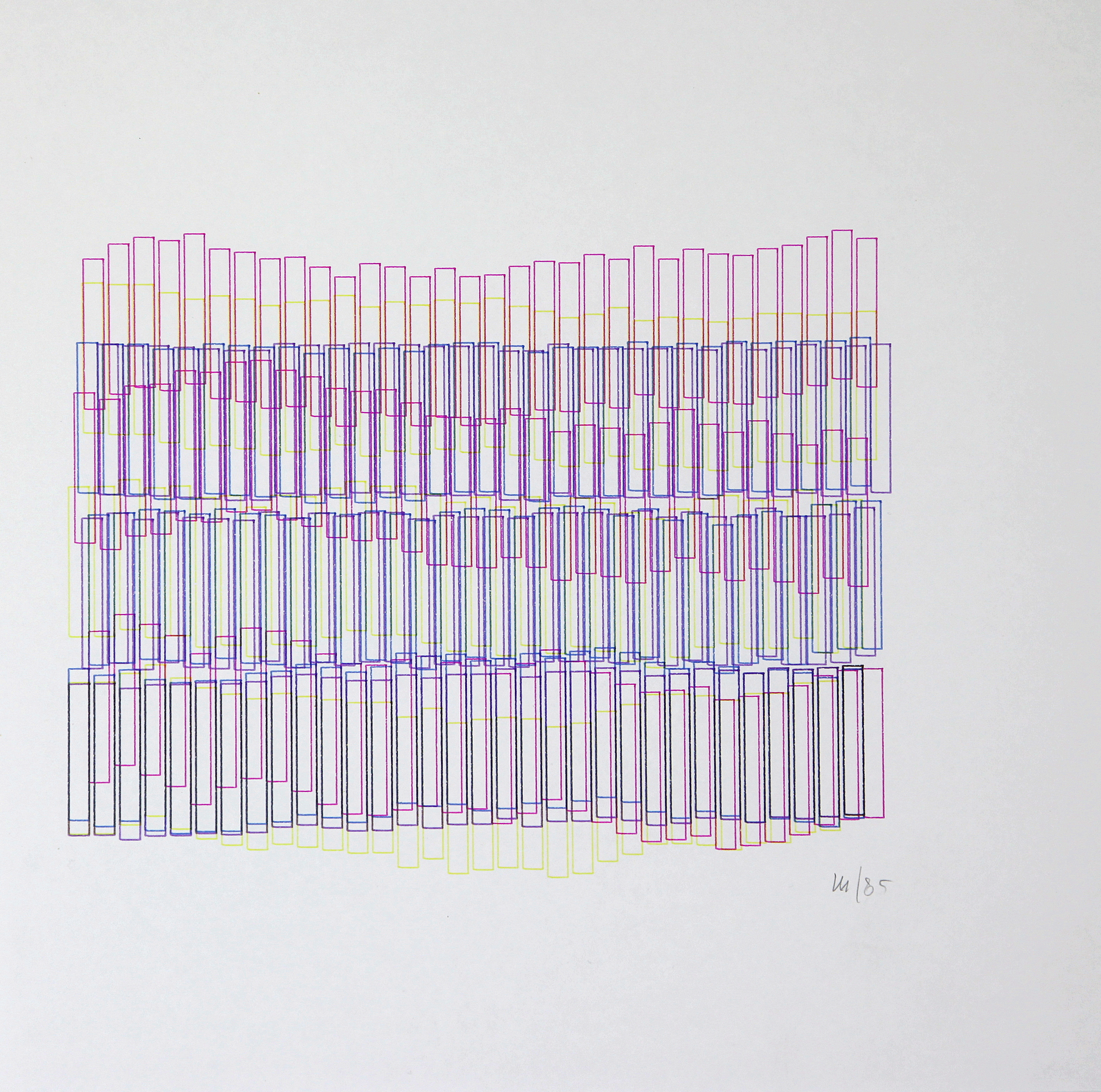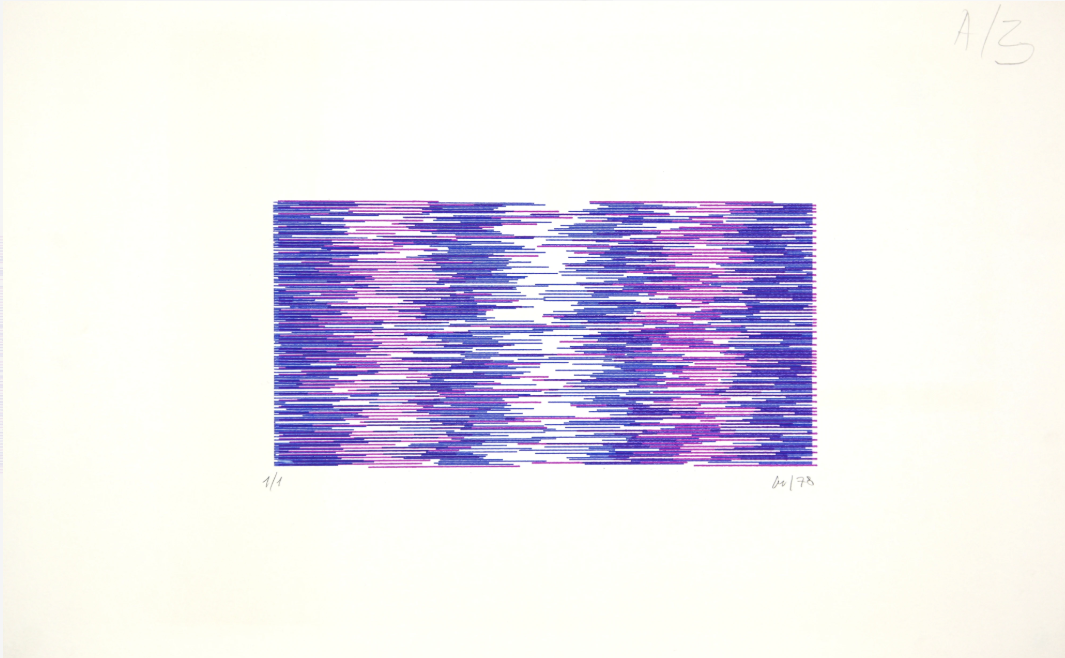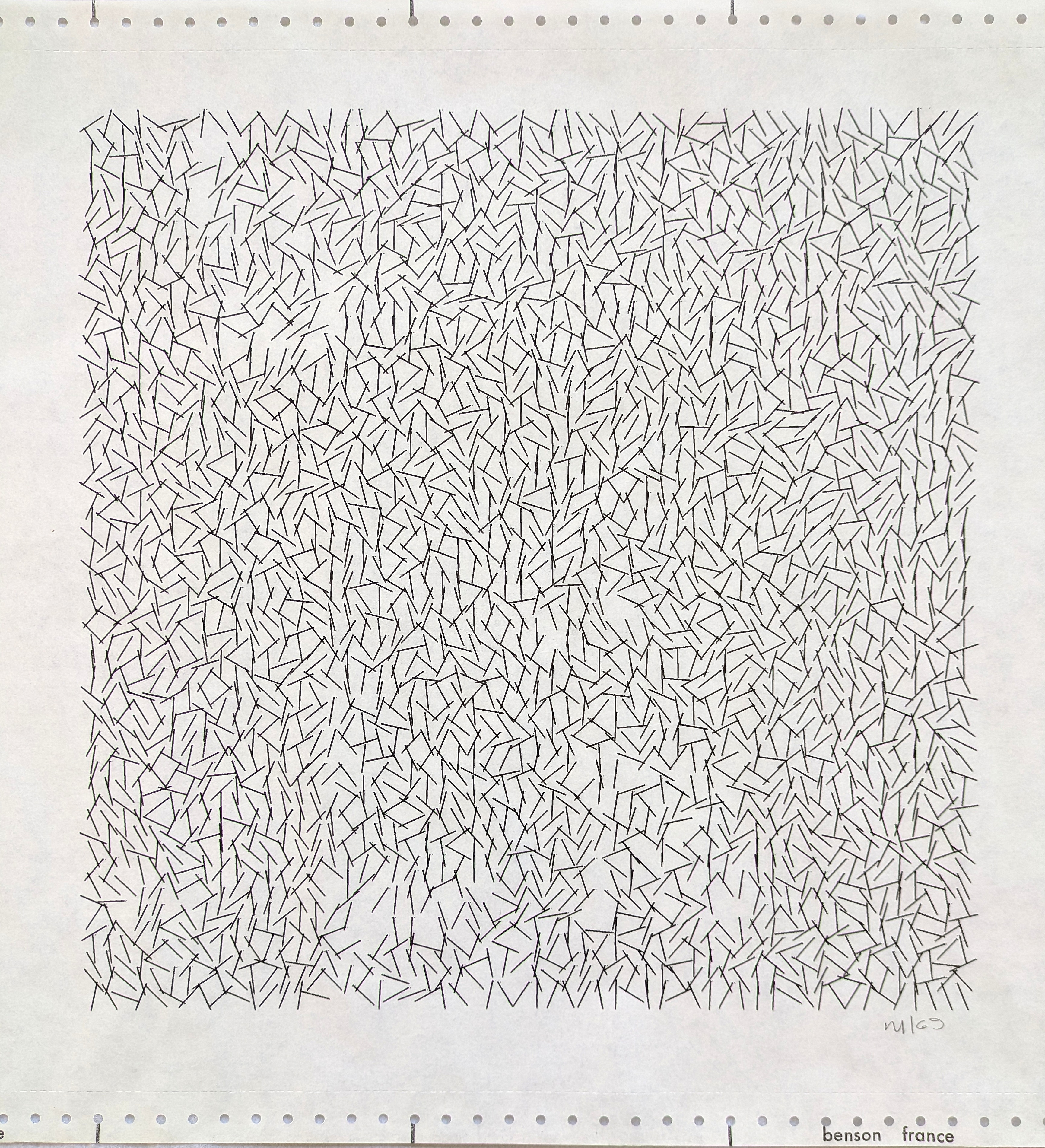 After moving to Paris in 1947, she became part of a vibrant network of artists experimenting with Concrete and Kinetic Art, including François Morellet, Julio Le Parc, and others. During the 1960s, she began developing her own visual systems using the most elementary means: paper, ruler, compass, and index cards. These early analog experiments were guided by sets of strict rules—geometric compositions defined by seriality, repetition, and variation. She was interested in creating images that appeared as if they were produced by a machine, even before she ever touched a computer.
