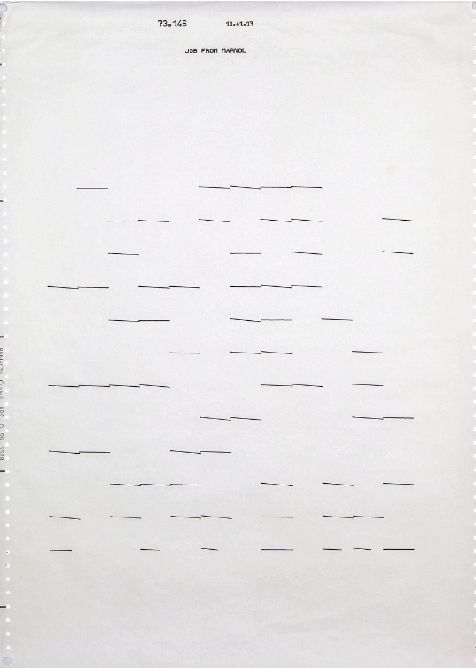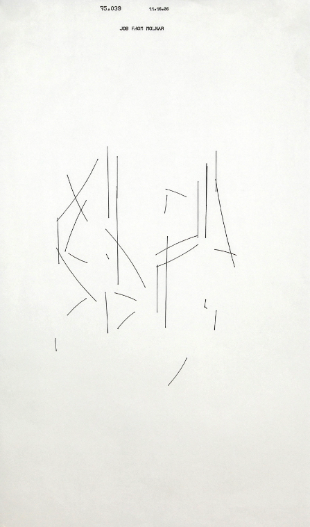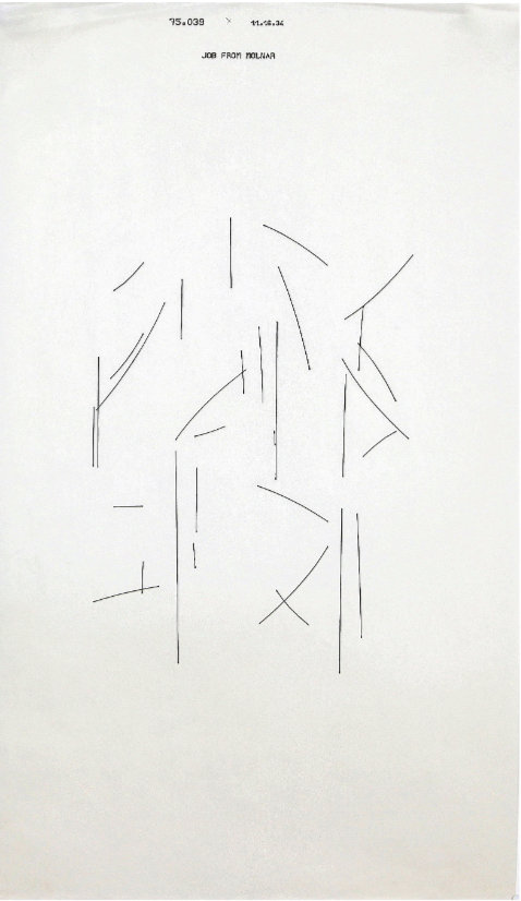 In 1968, Molnar began working with computers at the Sorbonne, one of the first artists to do so. Using early mainframe systems and plotter printers, she translated her imaginary machine into real algorithms—often written in collaboration with computer scientists. Her interest was never in the medium itself, but in what it could offer to the systematization and extension of visual possibilities. The machine was a tool for thought, a way to push beyond intuition and enter new territories of form, rhythm, and randomness.