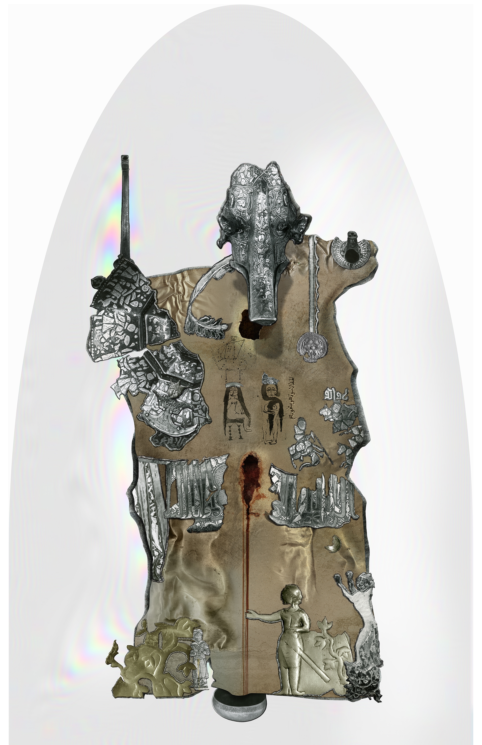 Die großformatigen, panoramischen Fotomontagen in der Ausstellung sind eine Symphonie aus Bruch und Heilung, während die Audiokunst den Raum mit einer universellen Sprache erfüllt und eine rhizomatische, forschungsbasierte Fiktion schafft, in der Geschichten und Historien miteinander verschmelzen.