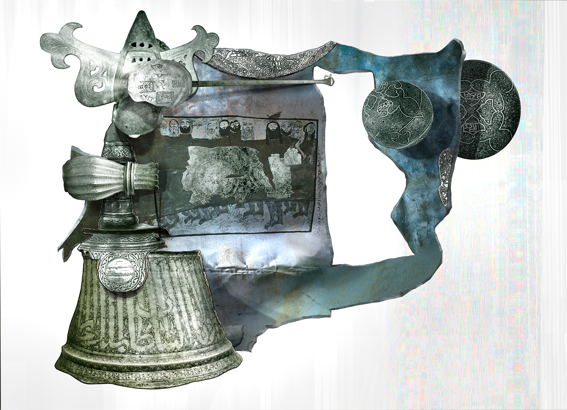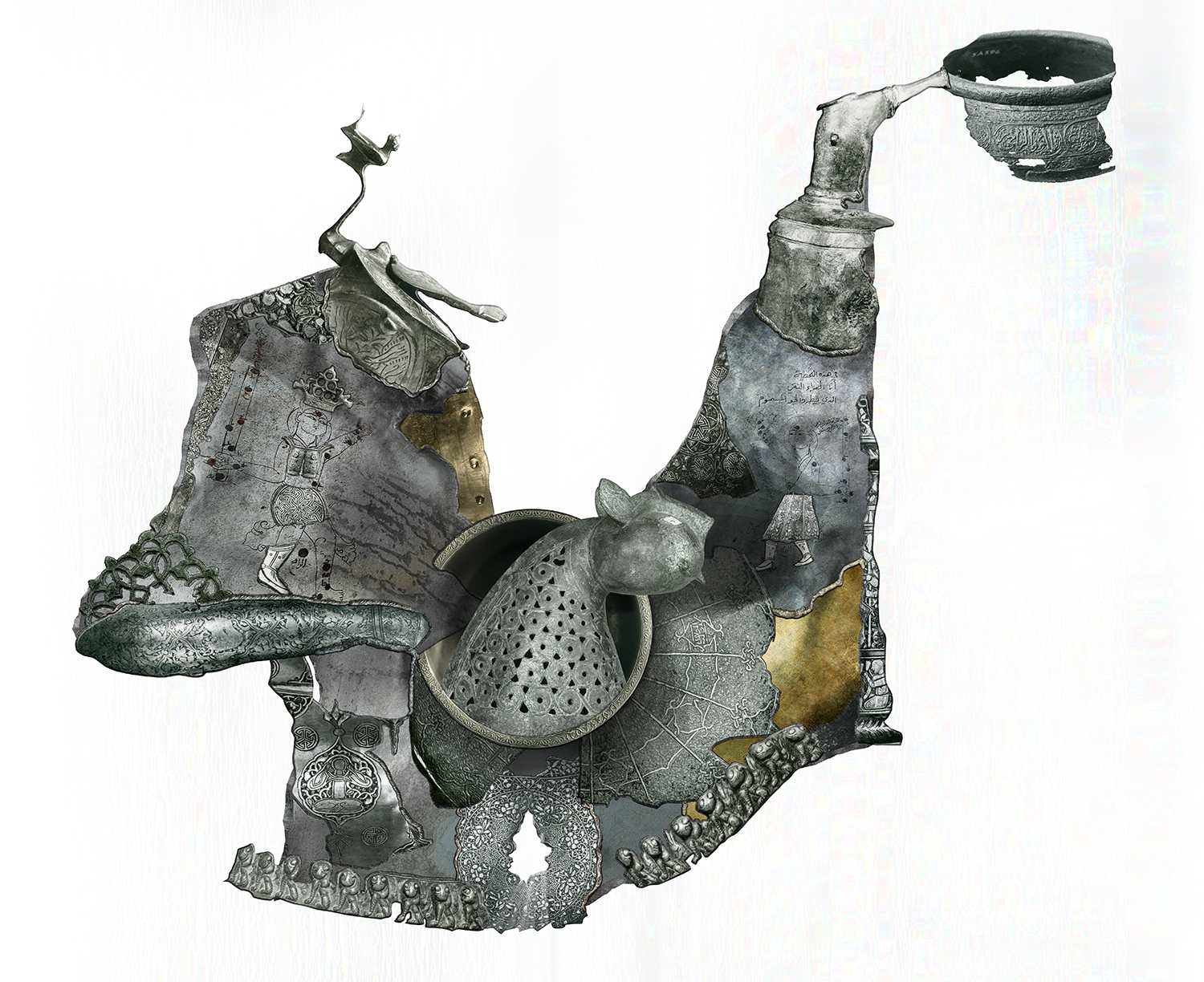 Die Ausstellung greift auf das fast vergessene Foto- und Dokumentenarchiv von David Storm Rice (1913-1962) zurück, einem Forscher mittelalterlicher Metallgefäße, und integriert die wertvollen Objekte, die im Nahen Osten hergestellt, im Levante-Raum gehandelt, über Venedig nach Europa gebracht und heute meist in westlichen Museen ausgestellt werden. Durch digitale Handwerkskunst zerlegt Azoulay die von Rice fotografierten Objekte und „lötet“ und „legt“ sie dann digital neu auf Metallplatten ein, wodurch ihr Geschlecht im Prozess transfiguriert wird. Die resultierenden Kartographien zeigen Leerräume, Verschiebungen und Ersetzungen in den Geografien des Wissens.