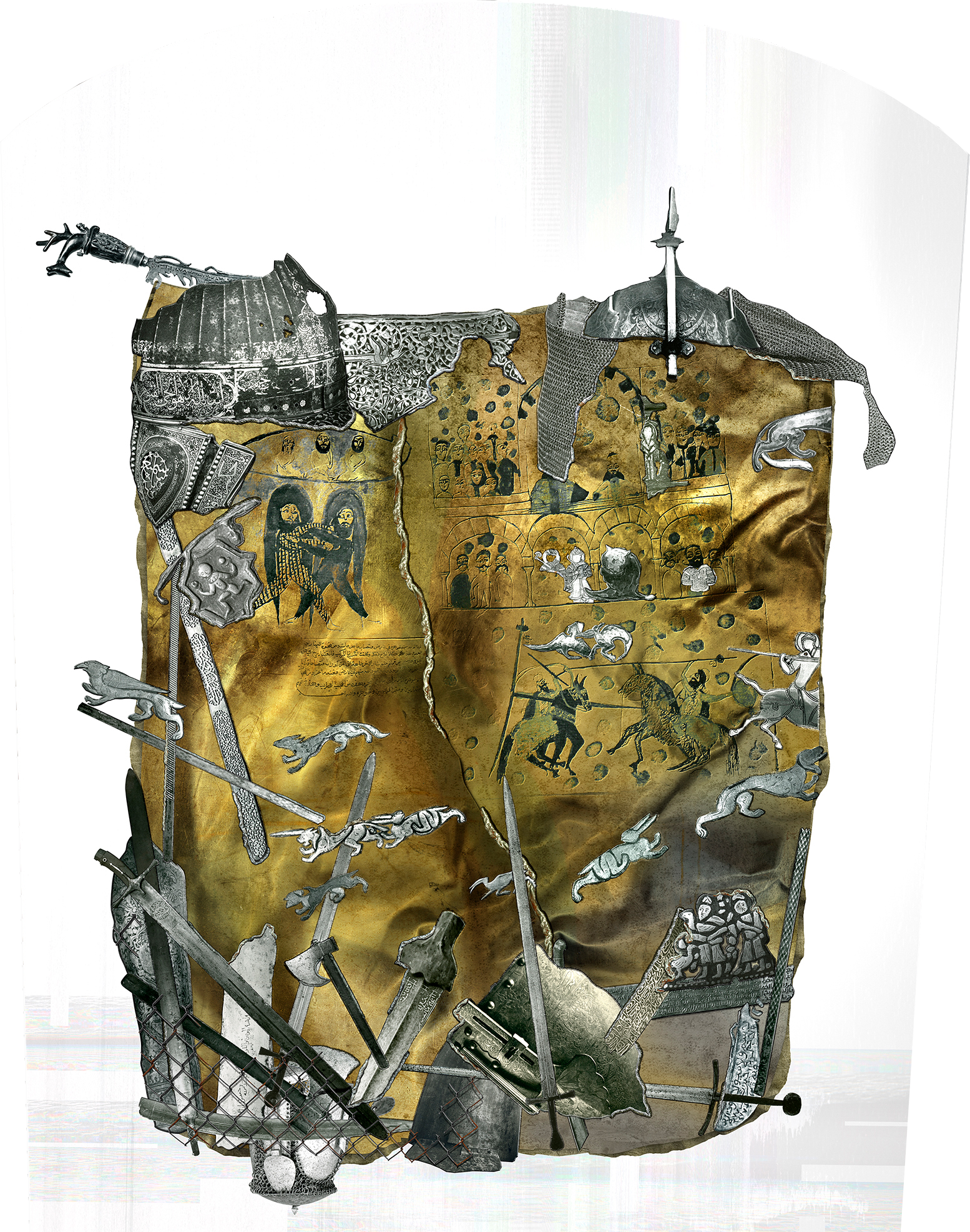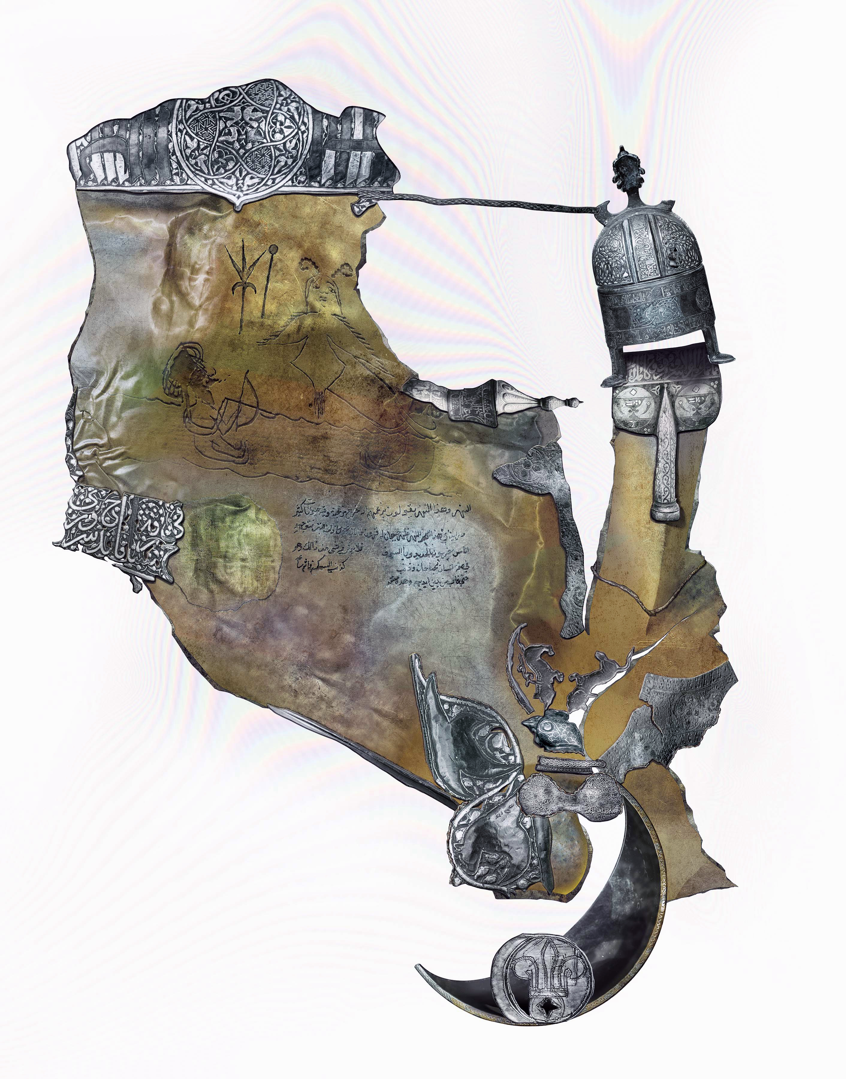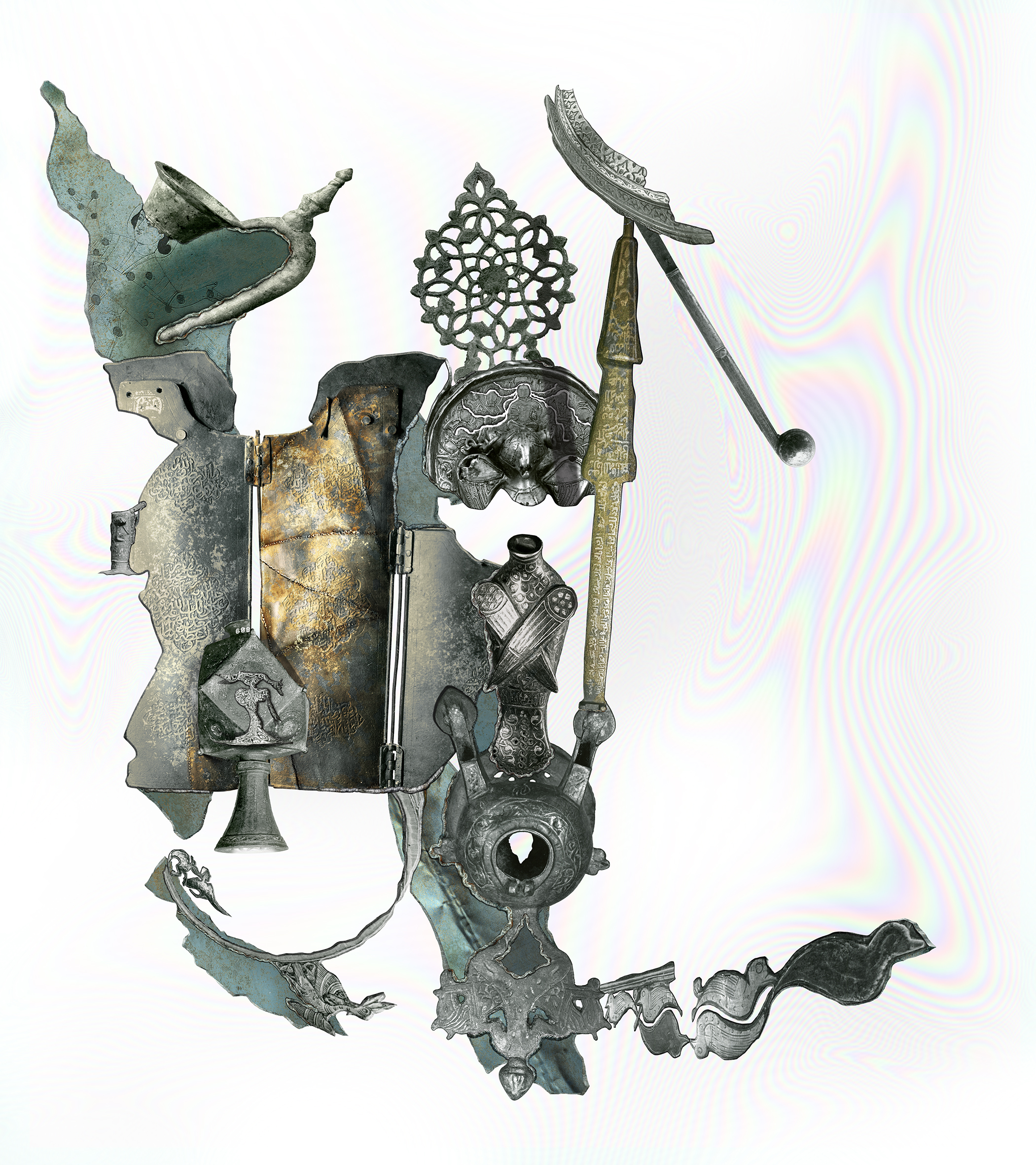 The exhibition draws on the almost forgotten photo and document archive of David Storm Rice (1913-1962), a researcher of medieval metal vessels, and incorporates the precious objects that were manufactured in the Middle East, traded in the Levant, brought to Europe via Venice, and now mostly displayed in western museums. Through digital craftwork, Azoulay disassembles objects photographed by Rice, then digitally "soldiers" and "inlays" them anew on metal panels, transfiguring their gender in the process. The resulting cartographies display voids, displacements, and replacements in the geographies of knowledge.